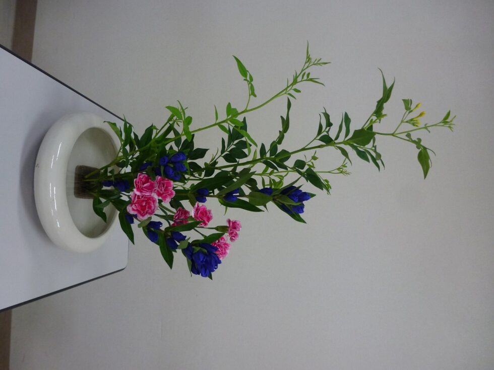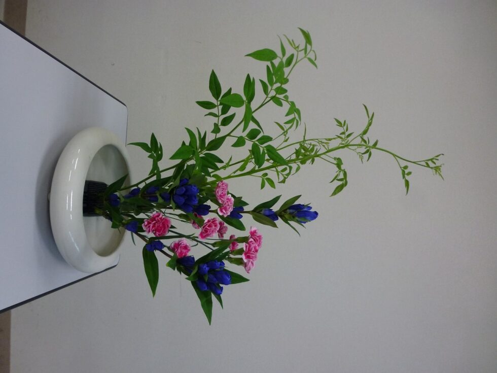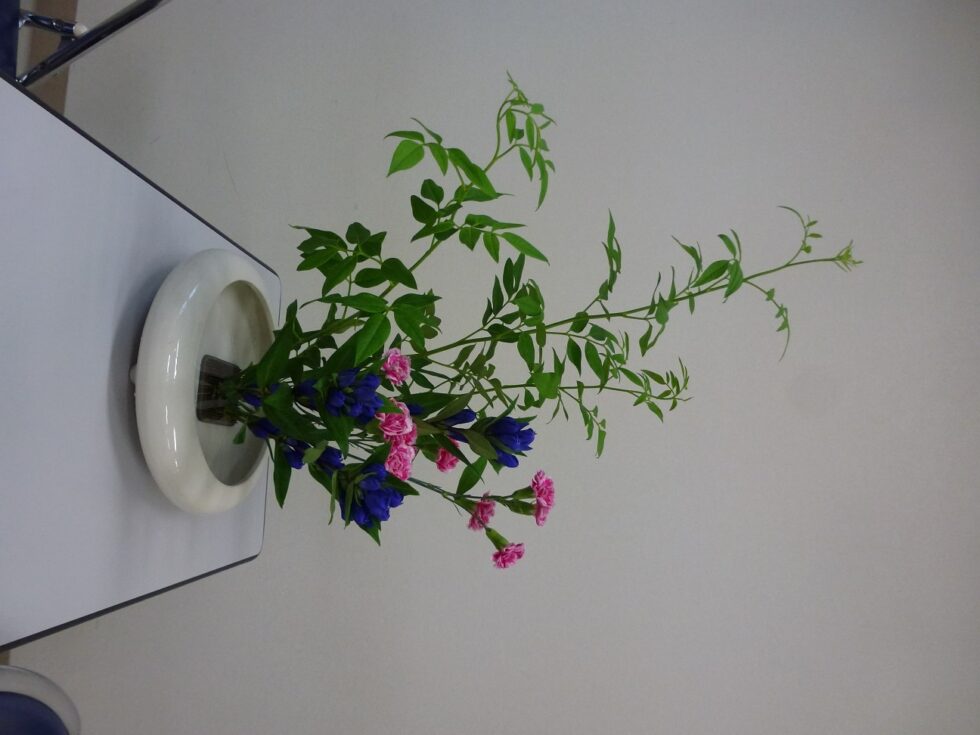 今月は、暑さを一瞬でも、忘れられるように、一足早い秋を思わせる、紫色のりんどうを真ん中に、カーネーションのピンクがかわいく咲いています。