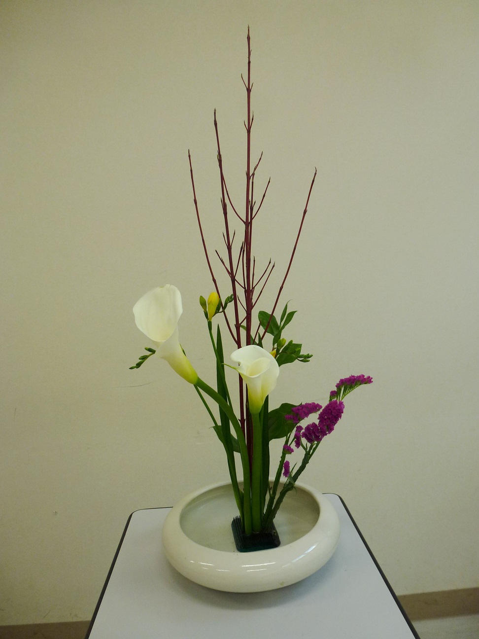 主役は、サンゴミズキの赤い記です。それに沿って、からあの白、すたーちすのピンクと黄色いフリージャーが寄り添っています。足元にレモンリーフの具林の葉っぱが全体をまとめていて、いつもの盛り花とはちがい、すっきり、まとまっています。冬のお部屋に和やかな雰囲気をただよわせるおはなです。よくご覧ください。