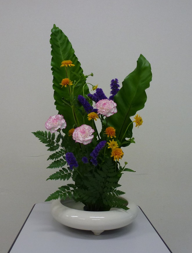 ピンクの縁どりの白いカーネーションとそれより小さい黄色の姫ひまわり、縦に長い紫色のスターチス、形の違う3種のお花がそれぞれにリズミカルな動きをだしています。