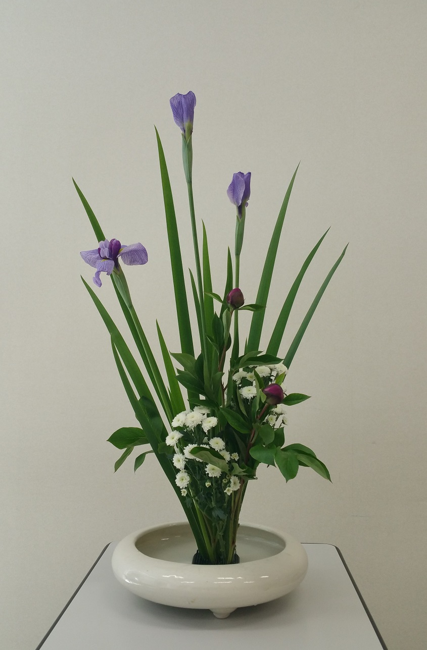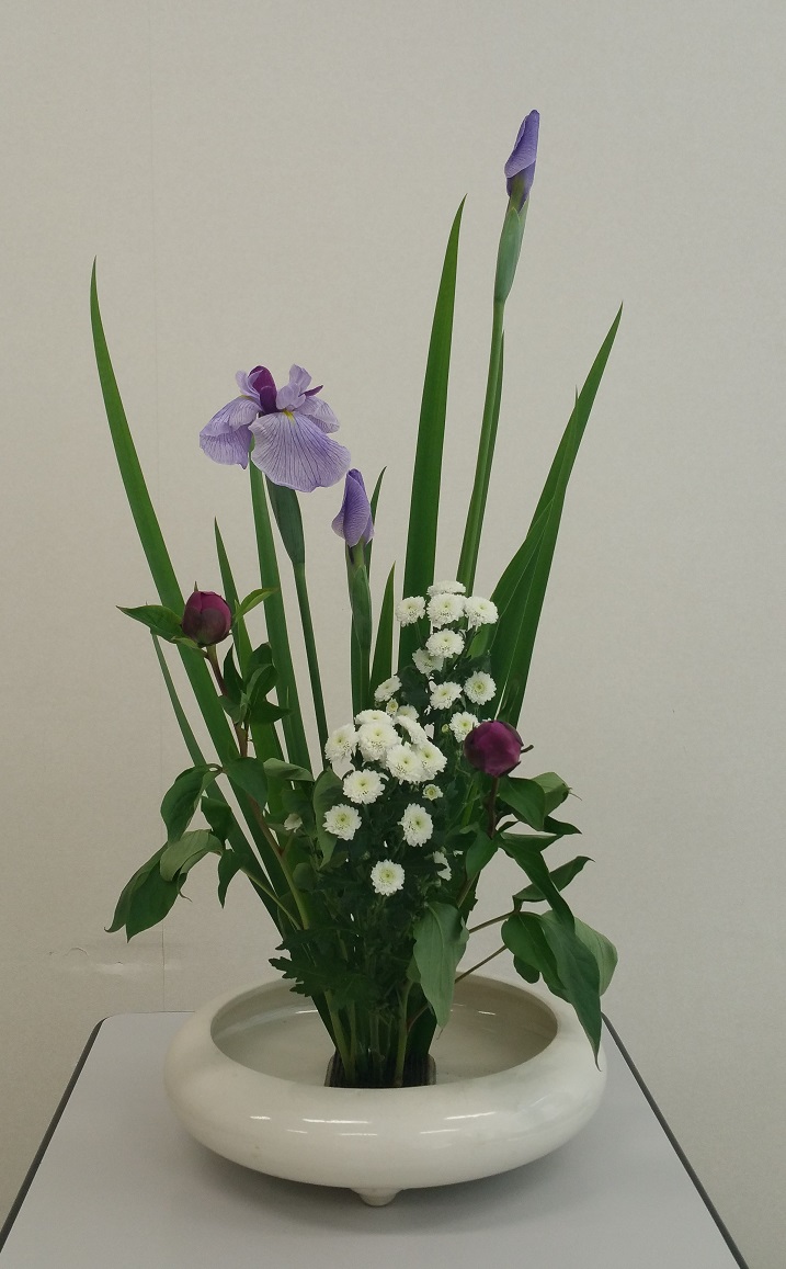 今月は、紫のしょうぶが主役です。シャクヤクの濃いあかと、白い小菊がよりそい、