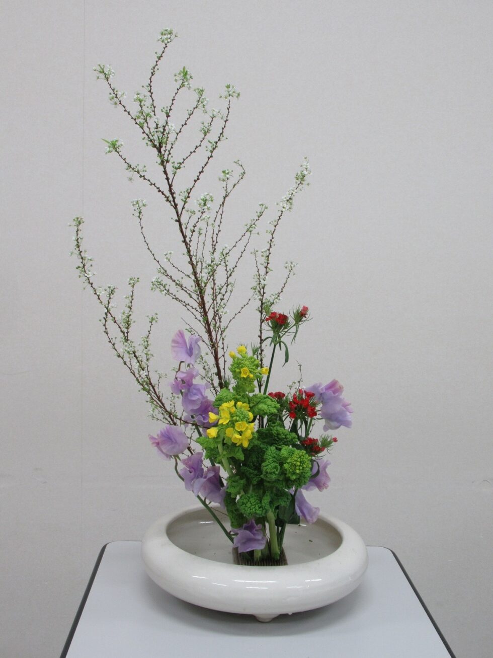 こんにちは、大寒の真っ只中ですが、おはなの世界には、春がやってきました。本日 の主役は、白い雪柳です。薄紫のスイトピー、赤いなでしこ、黄色の菜の花が温かく て明るい春を演じています。希望の春はすぐそこです。