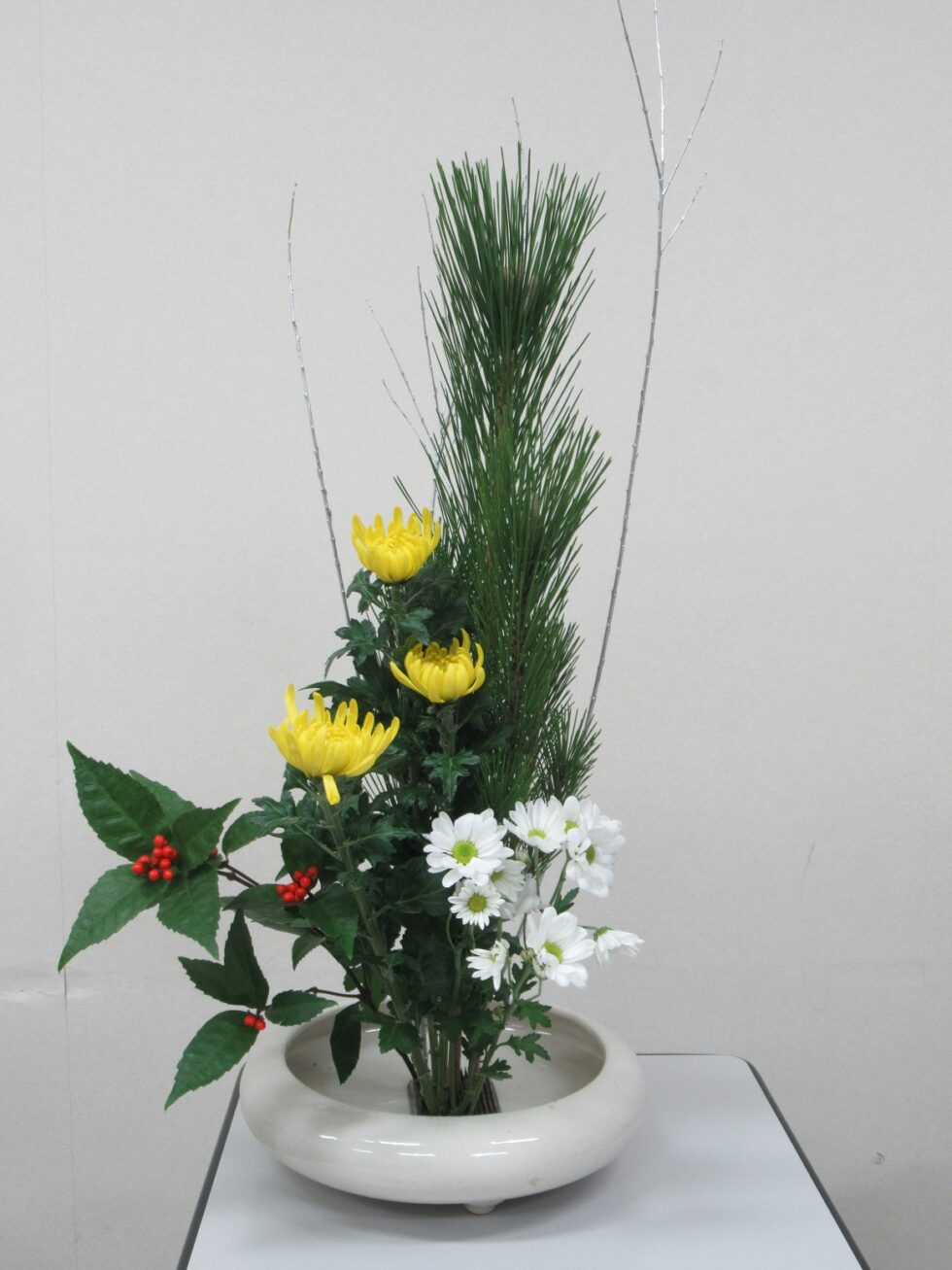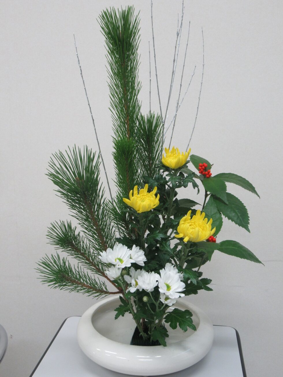 生け花教室より、お正月のお花です。 赤い千両と緑の枝若松が主役です。 銀柳と白のスプレー菊、そして、黄色の一厘菊が明るい楽しさを演じています。