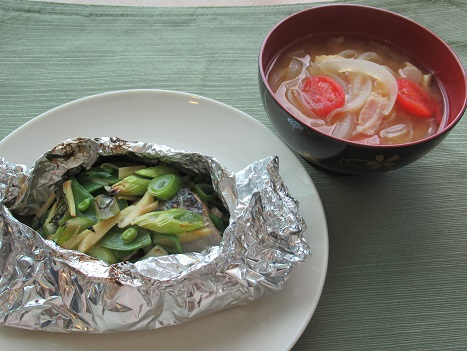「新玉ねぎの洋風味噌汁」は、季節の新玉ねぎいっぱいで、オリーブ油やベーコンも使ってるのに、あっさりすっきり。お味噌とミニトマトの相性も良いそうです。