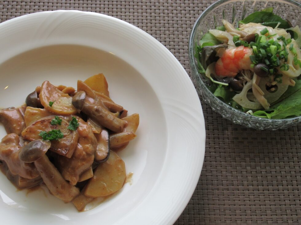 鶏肉と色々きのこのブラウンソースは、鶏のもも肉とたくさんのキノコを入れ、野菜も加えて、味付けは味の素のビストロドゥのシリーズの中の、鶏肉のブラウンソースを使いました。調味料を揃えなくても、手軽に本格的な味付けができ、おいしくいただきました。