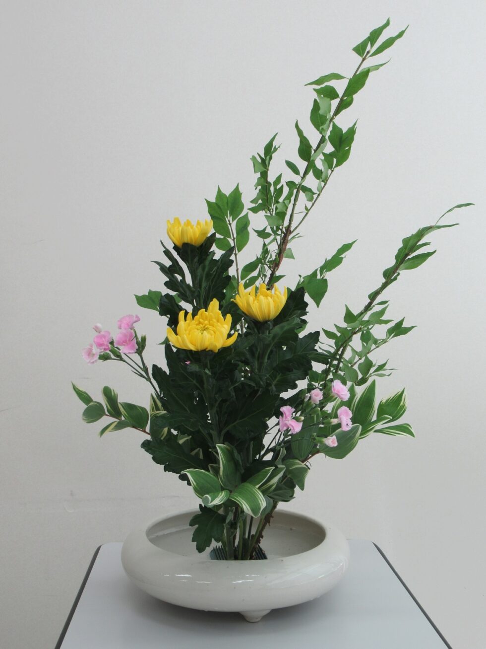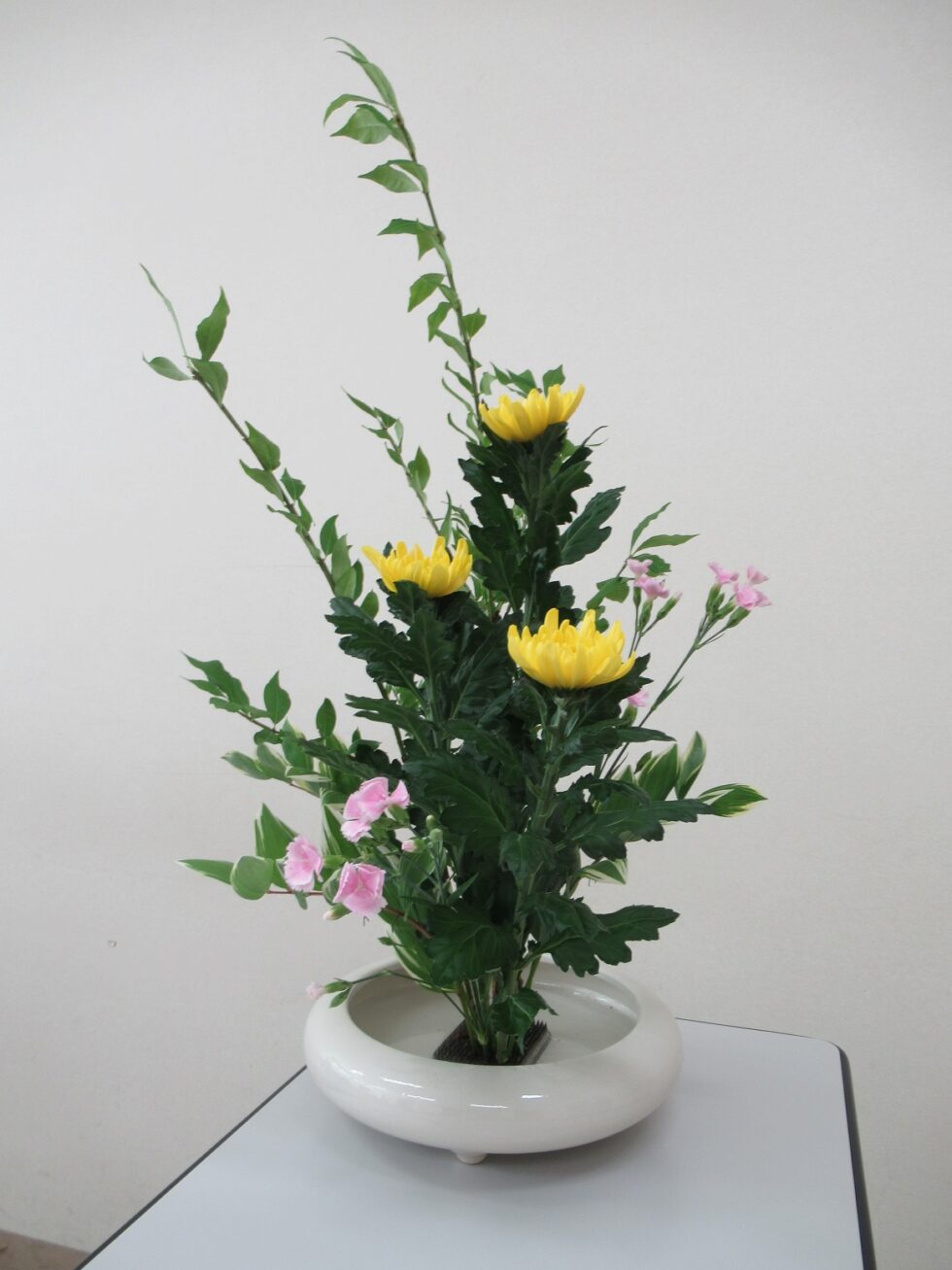 大きな黄色の菊とピンク色のフワフワとした撫子が、緑色の葉っぱの中で映えています。