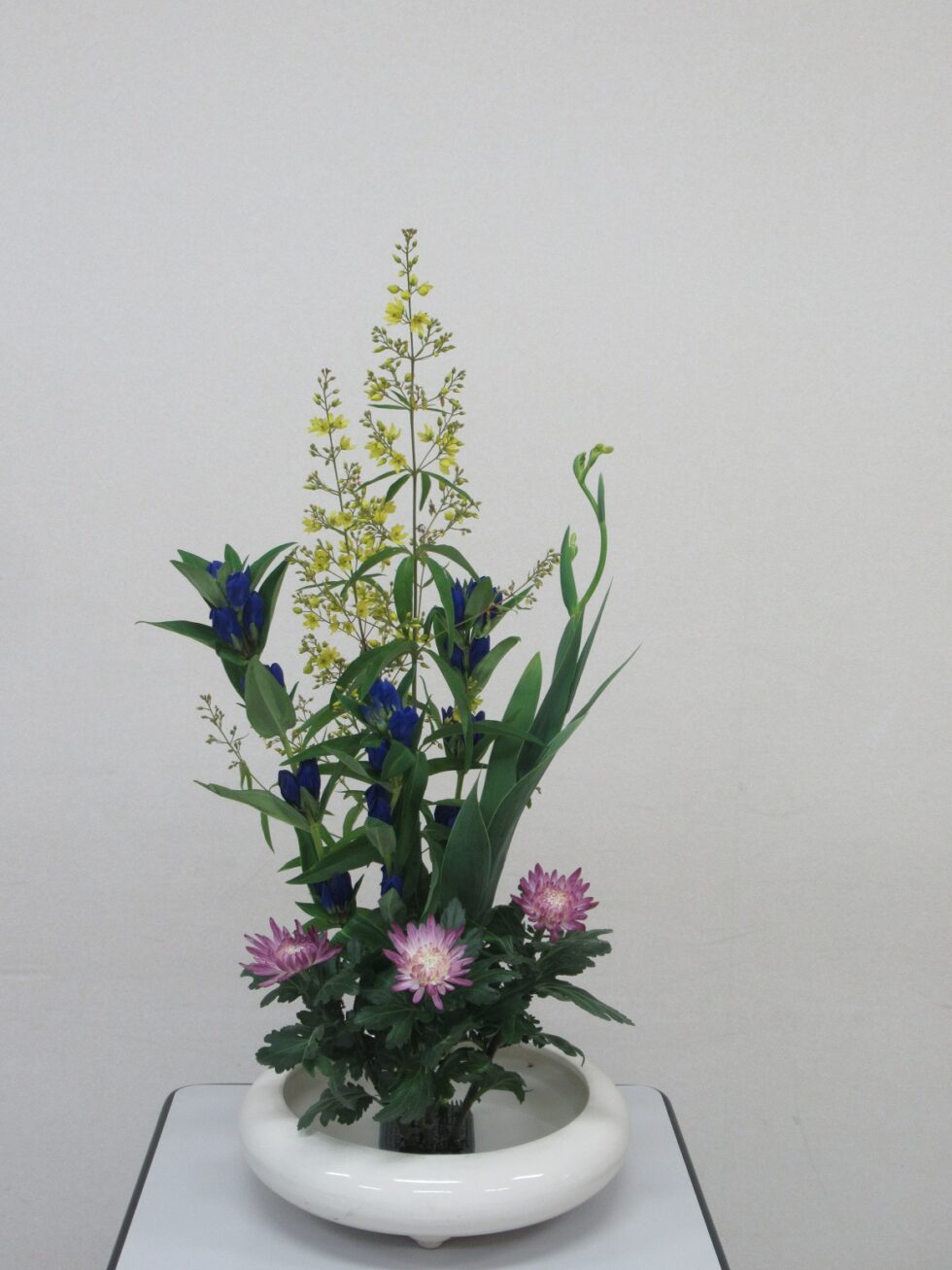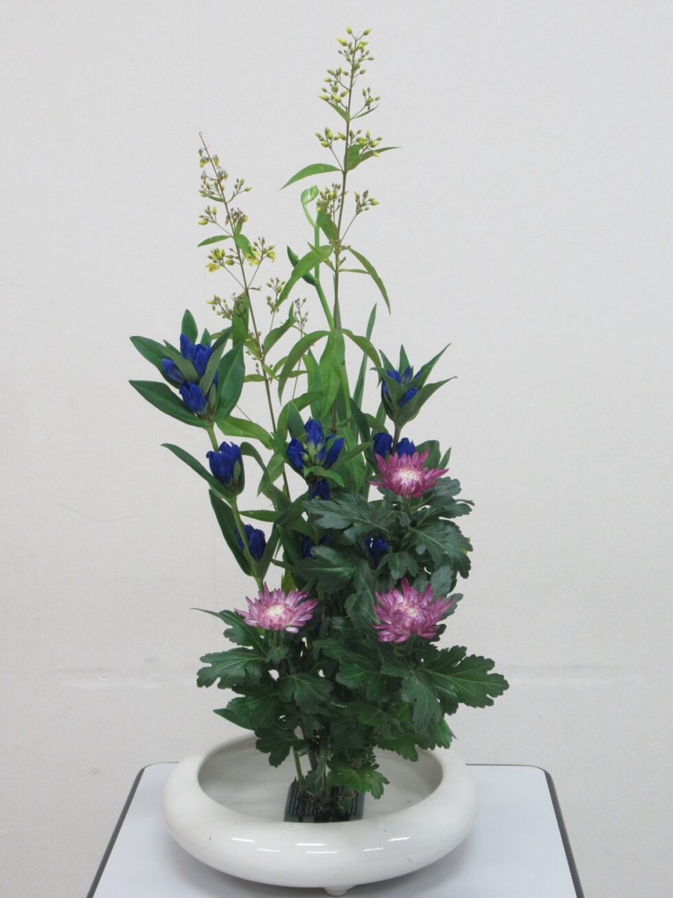 中央に黄色の「黄蓮玉」と紫色の「リンドウ」、足元に赤い「菊」と緑色の「檜扇」 たくさんの色がバランスよく生けられています。