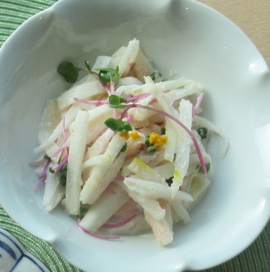 大根のたらこマヨネーズ和え ゆず風味はシンプルな大根のたらこマヨネーズですが、ゆずの皮を下ろし大根の上に盛るだけで高級感が出ました。大根の細切りも細かったり、ちょっと太かったりしてそれぞれの歯ごたえの違いが面白いと感じました。