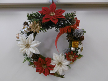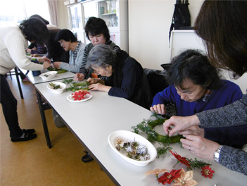 4.12月13日、当センターの「おしゃべりサロン」にて、13人が参加してクリスマスリース作りを行いました。皆さんが作りやすいようにと講師の方が様々な工夫してくださり、土台に飾りを挿していくだけで華やかなクリスマスリースが完成しました。皆さんとても楽しそうに作っておられました。